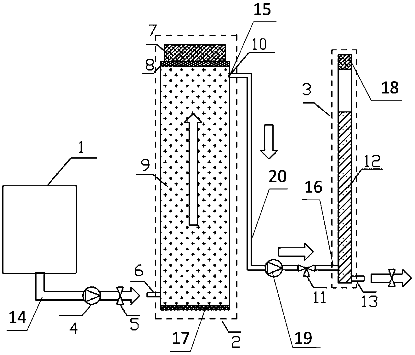 7.根據(jù)權(quán)利要求1所述的一種廢水 脫氮除磷的裝置,其特征在于:所述的磷過濾柱(3)與反硝化柱(2)之間通過連通管(20)連接,連通管(20)上設(shè)有連通蠕動泵(19)和三通止回閥(11)。