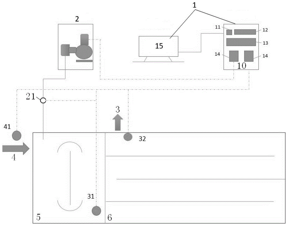 圖1、2中的標(biāo)記為:1-控制裝置;10-自控柜;11-電氣柜設(shè)備開關(guān);12-接觸器;13-接線端子;14-變頻器;15-工控機(jī);2-變頻加藥泵;21-加藥流量計(jì);3-出水管;31-前饋硝態(tài)氮在線儀表;32-反饋硝態(tài)氮在線儀表;4-進(jìn)水管;41-進(jìn)水在線流量計(jì);5-缺氧池;6-好氧池;7-反硝化濾池。